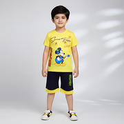 Sunny Summer Look: Bright yellow tee paired with navy shorts makes a cheerful warm-weather outfit. The same bold bear-and-motorbike graphic and spirited text give it adventurous flair.
